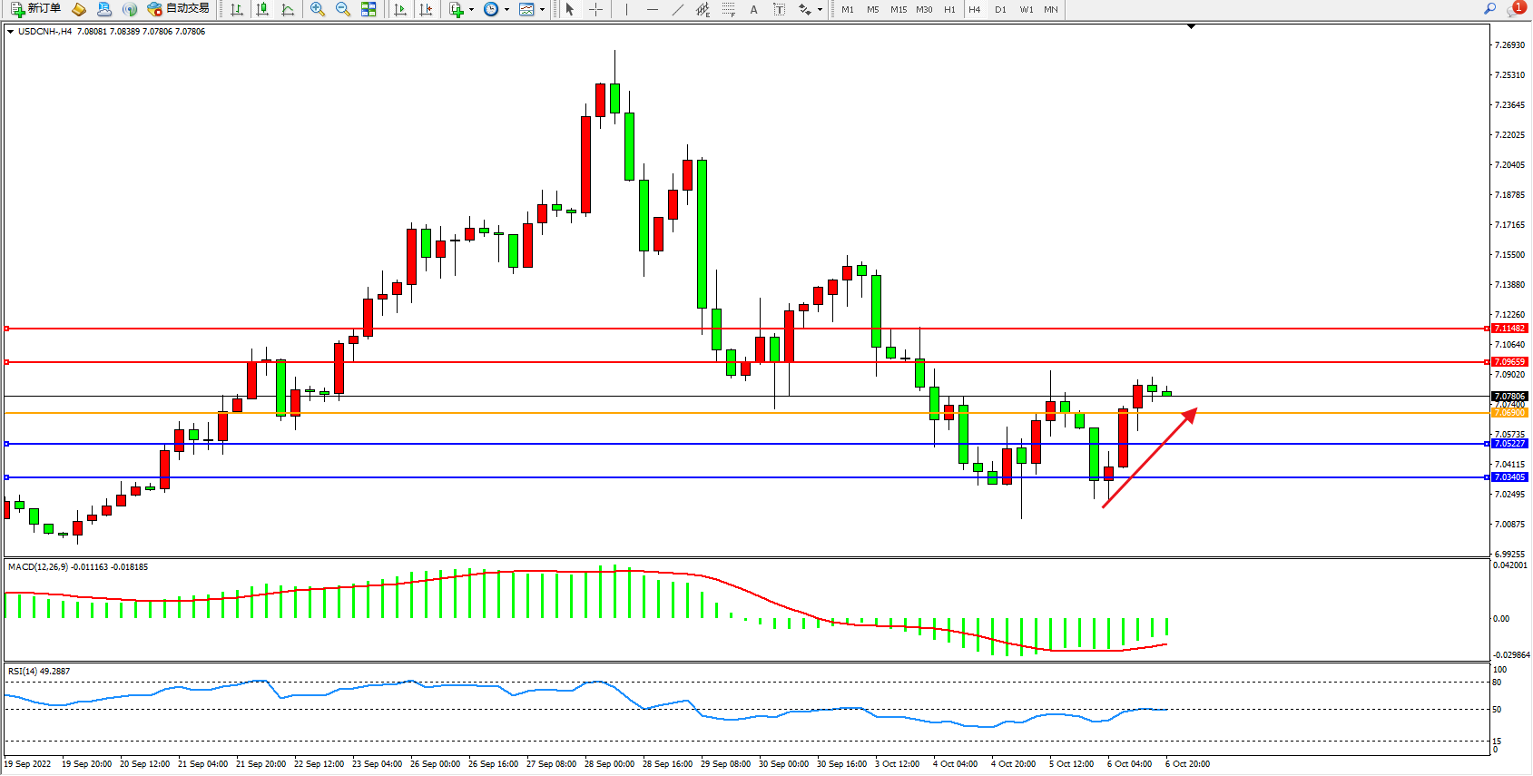 备选策略:7.06900下方看跌,目标7.05227、7.03405