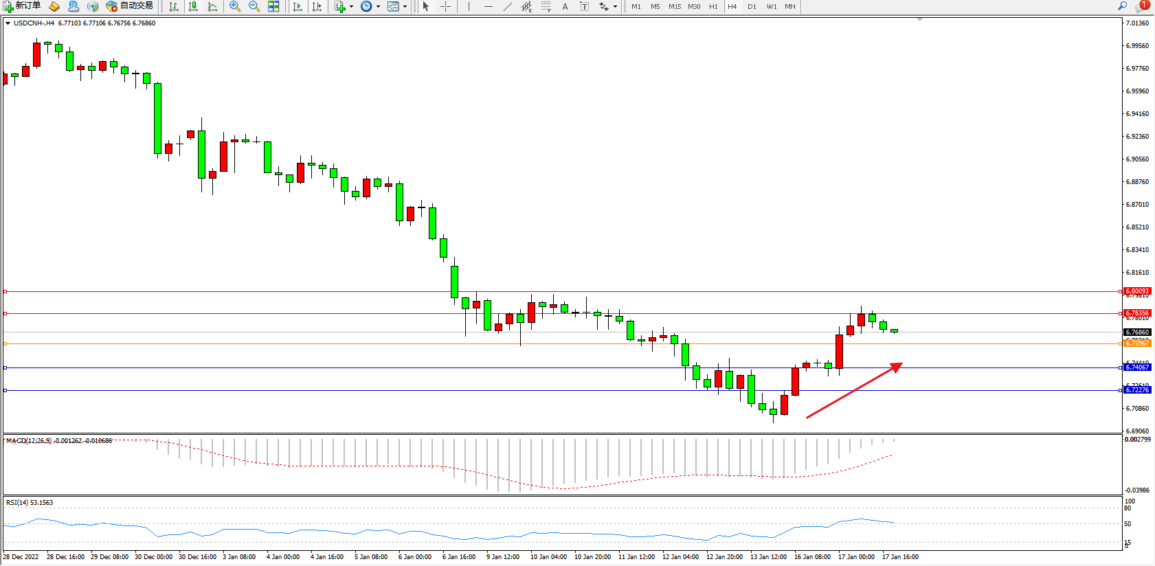 美元人民币USDCNH——4小时K线图显示: