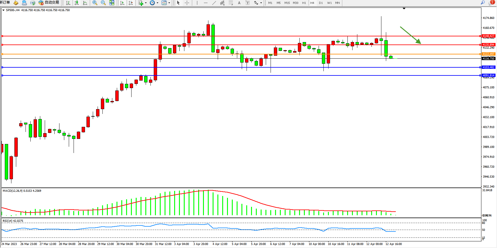 标普500指数4月12日(周三)收盘下跌16.91点,跌幅0.41%,报4092.03点;美国劳工统计局数据显示,3月CPI同比上涨5%,与2月份录得的6%相比,这标志着通胀大幅减速,这也是自2021年5月以来的最低水平。