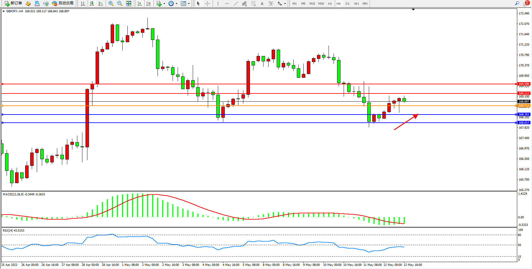 交易策略:168.711上方看涨,目标169.212  169.598