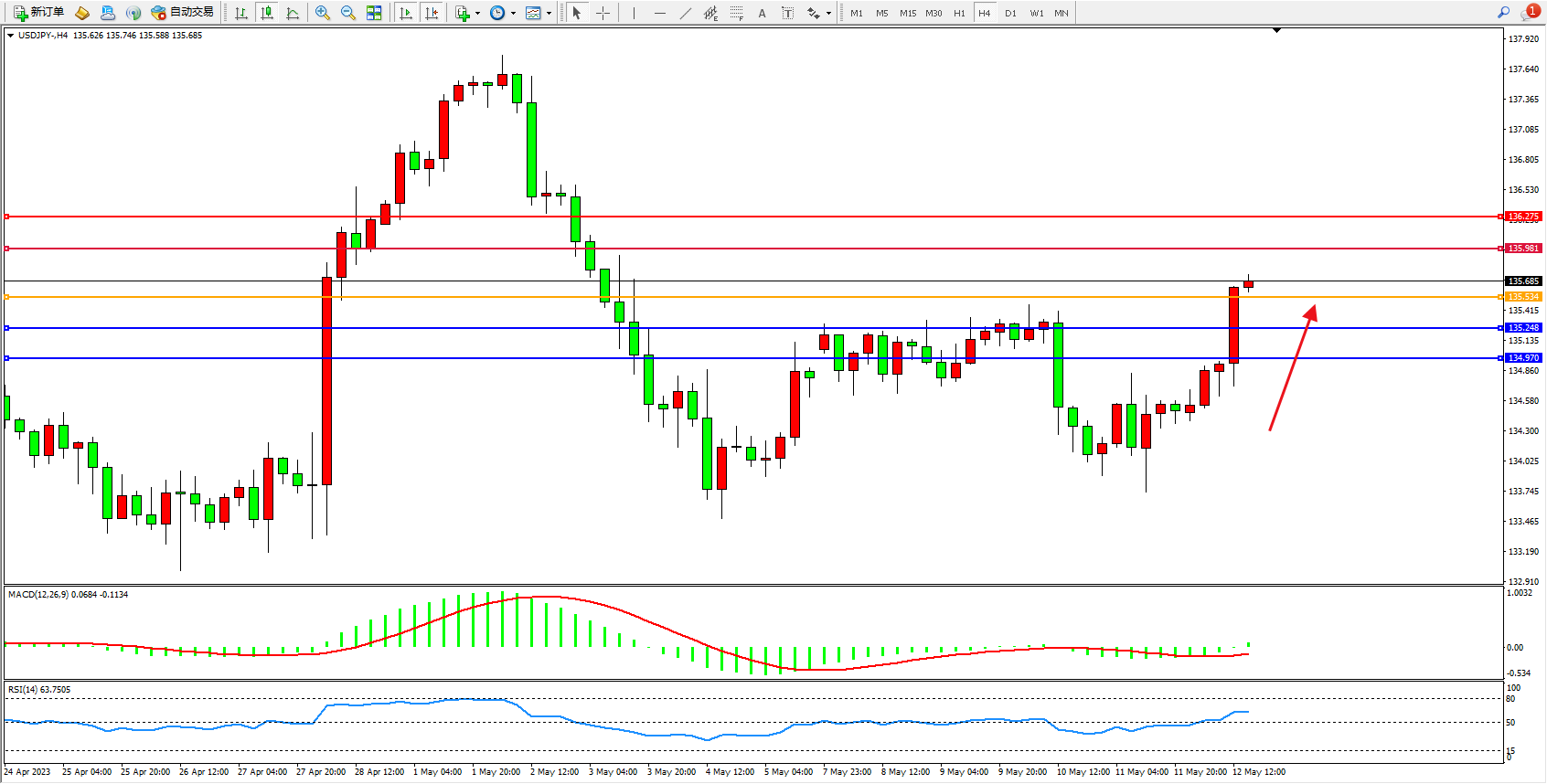 美元兑日圆维持135.685附近震荡,日本4月的核心CPI(除却食品但囊括能源)可能会同比增长3.4%,这一增速将高于3月和2月的3.1%,是自1月创下的41年高点4.2%以来的最快增速。