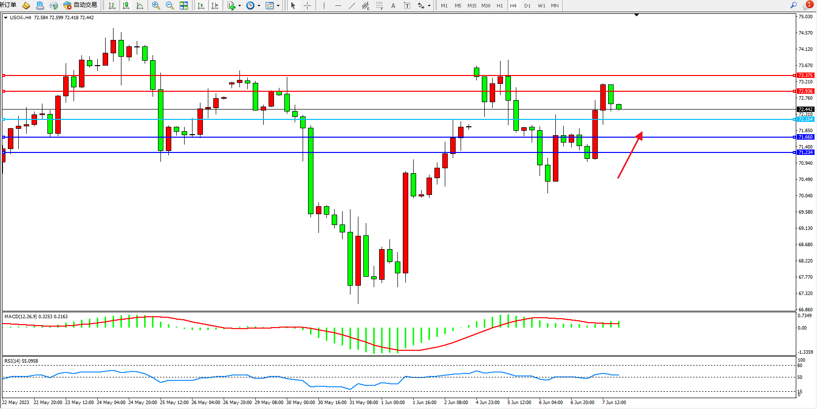 原油维持72.442附近震荡,美国至6月2日当周EIA原油库存 -45.1万桶,预期102.2万桶,前值448.9万桶。EIA俄克拉荷马州库欣原油库存 172.1万桶,前值162.8万桶。