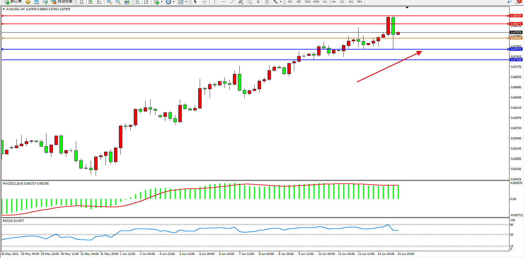 交易策略:0.67836上方看涨,目标0.68171 0.68359