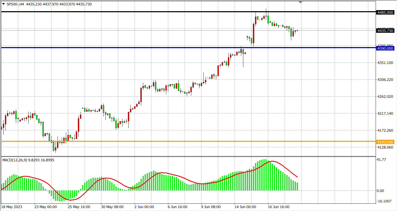 4小时图看,标普在4490之下继续回落,短期压力明显,MACD量能在零轴上开始缩量,行情进入回调,下方支撑4420-4385,上方看4490-4520。