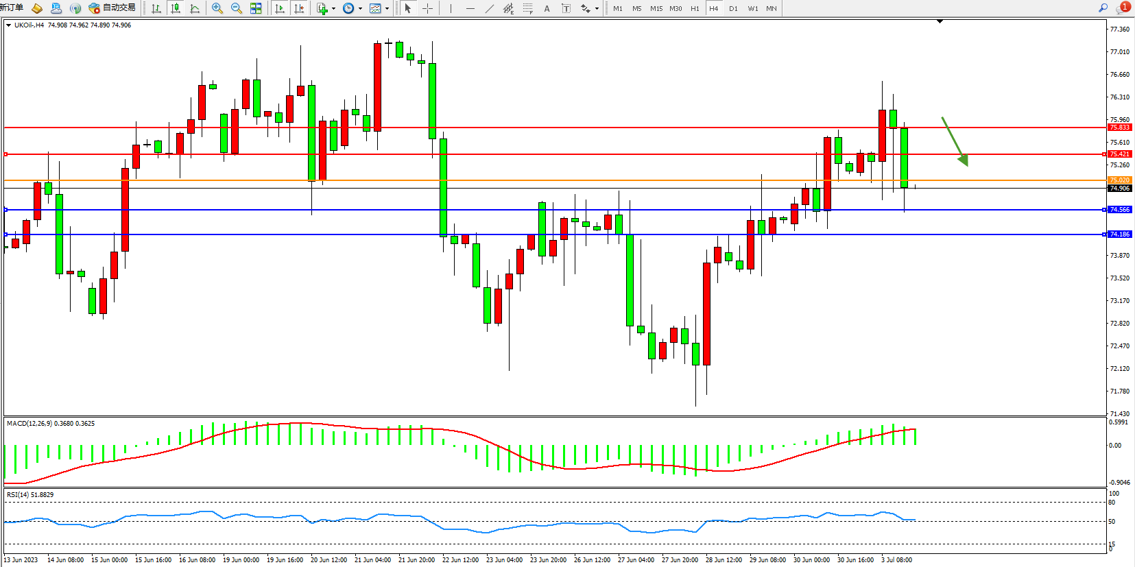交易策略:75.020下方看跌,目标74.566 74.186