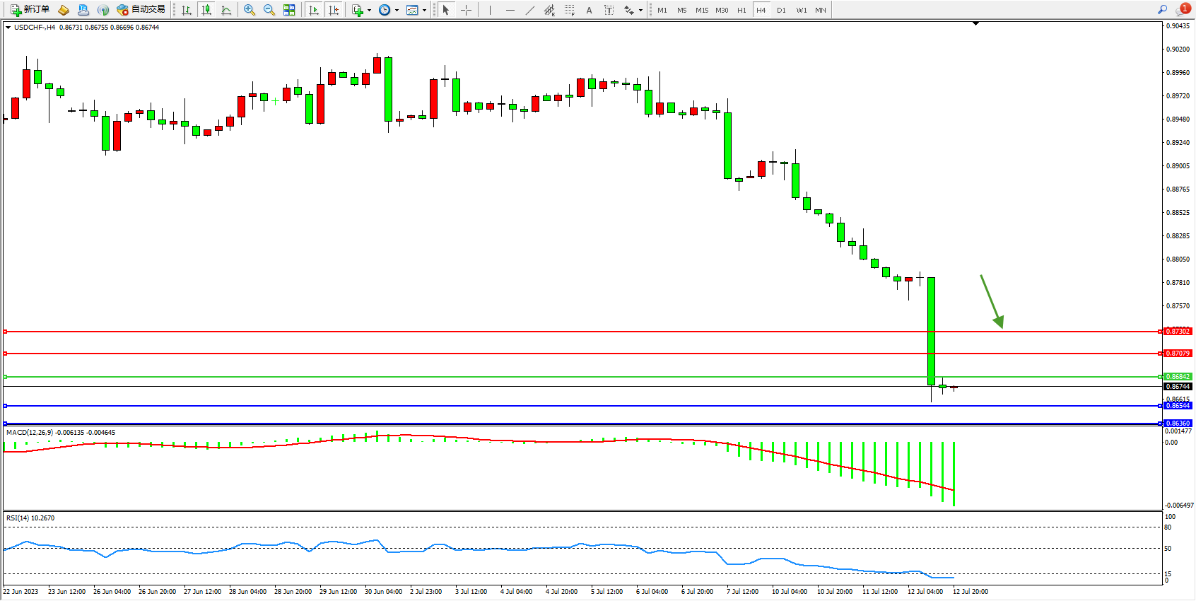 美元兑瑞郎维持0.86842附近震荡,美国公布6月份CPI数据,整体与核心通胀年率均超预期走低,央行可能需要进一步加息才能确保物价增速回落到美联储2%的目标,但紧缩周期即将结束。