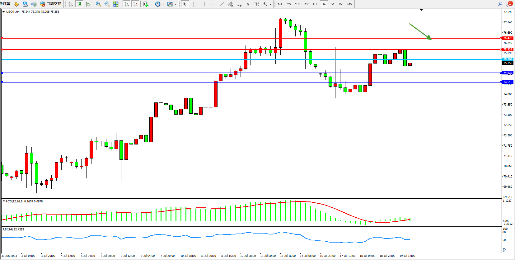 交易策略:75.506下方看跌,目标74.922 74.515