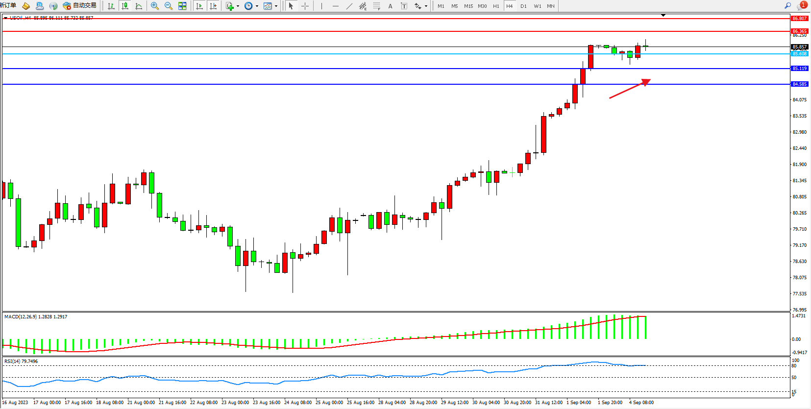 原油USOil——4小时K线图显示: