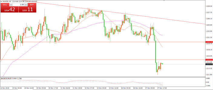 技术面简析:1小时图看,黄金连续下破1220、1215两道支撑,短期走势偏弱,MACD绿柱增加,操作上以逢高做空为主。