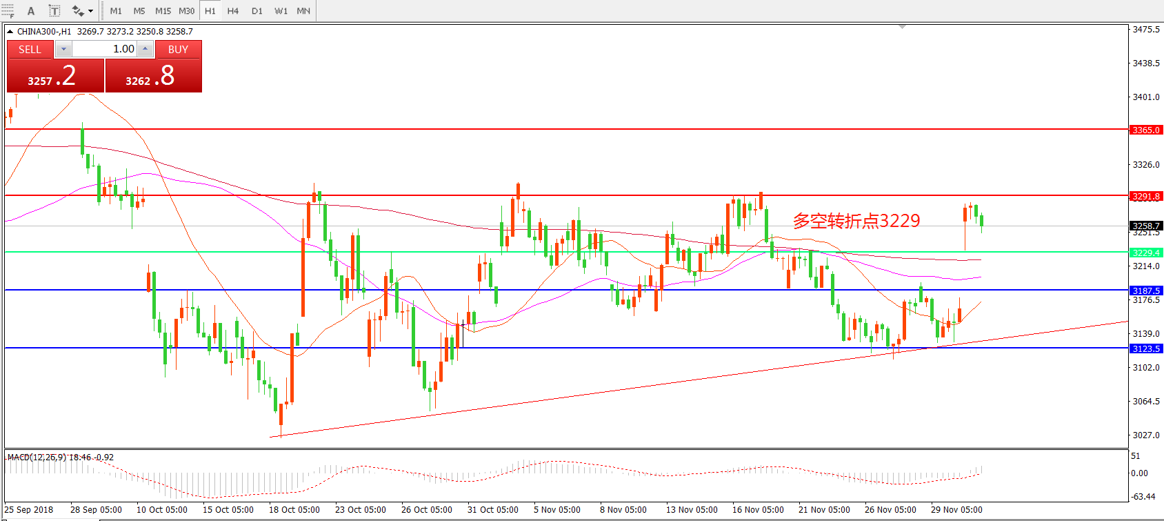 1小时图看,CHINA300中华指数跳空高开,站稳3229一线后稍有回落,但整体位于多空转折点之上,长期均线逐渐走平,短期21周期均线有拐头迹象,小幅反弹依然是大概率事件。
