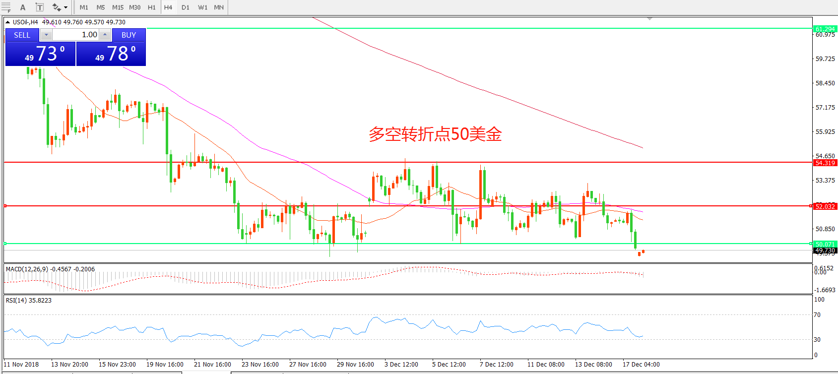 受美国股市下跌拖累,需求担忧再次打压油价。美国WTI原油价格周一(12月17日)收跌1.32美元,或2.58%,报49.88美元/桶,自2017年10月以来首度结算价低于50美元/桶。美股隔夜再暴跌,道指一度跌超600点,标普触及一年低位全球经济增长放缓忧虑加剧无疑令油价雪上加霜,悲观情绪蔓延多个市场令油价暂难出现实质性反弹
