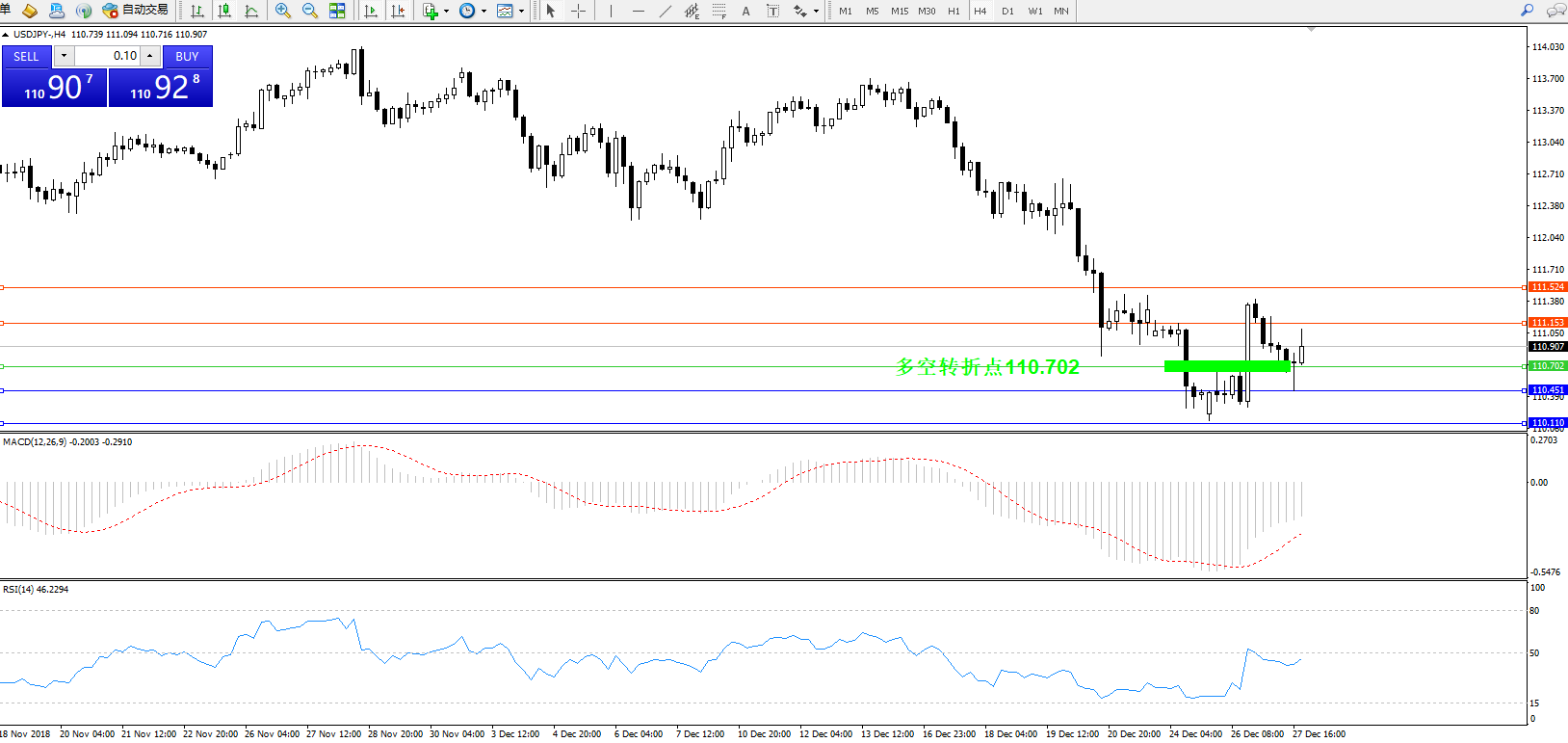 交易策略:110.702上方看涨,目标111.153、111.524