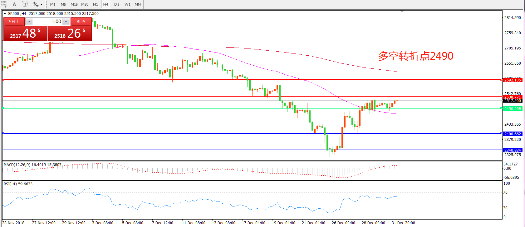 4小时图看,SP500目前已站稳55均线,形态上已经呈现见底迹象,MACD绿柱缩短,短期反弹概率较大。