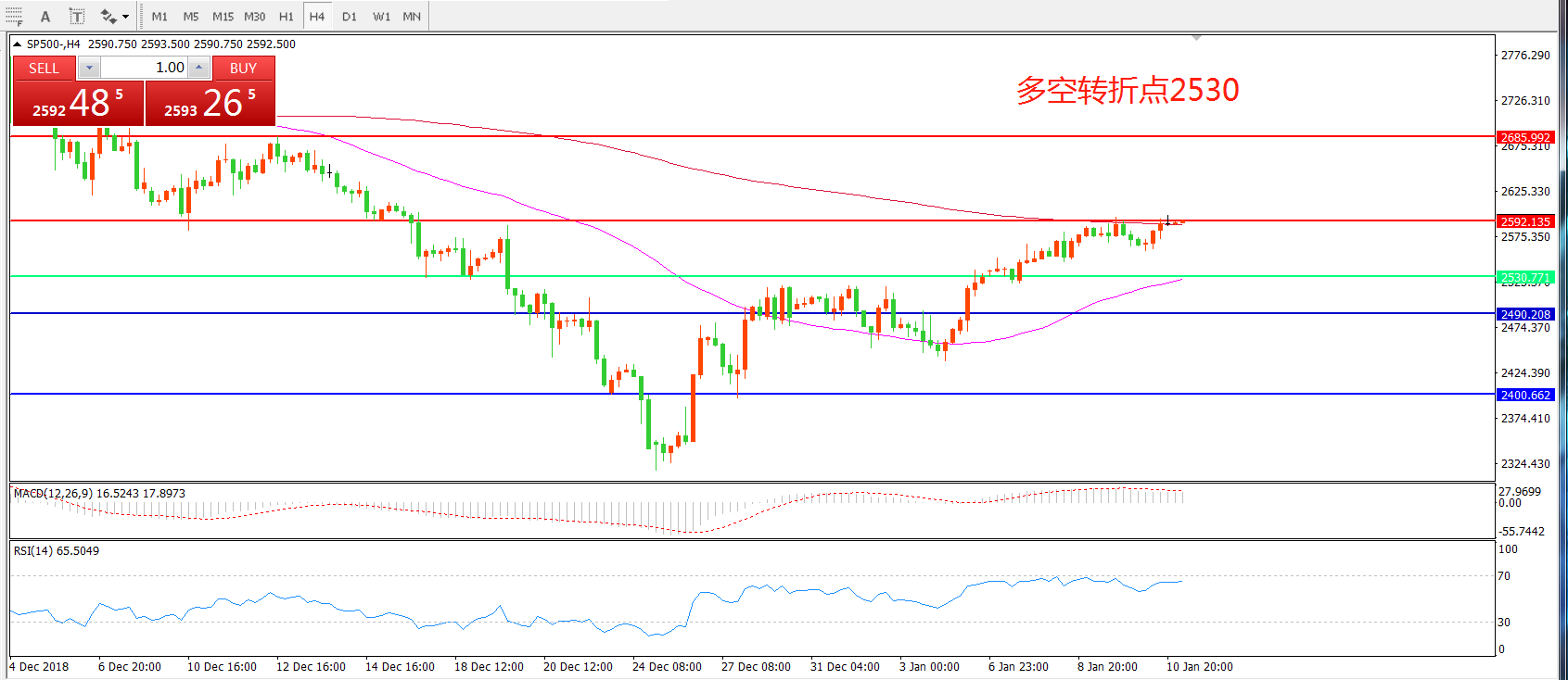 4小时图看,SP500站2490后强势上行,均线系统有拐头迹象,MACD红柱增加,RSI指标出现拐头,短期反弹概率较大。