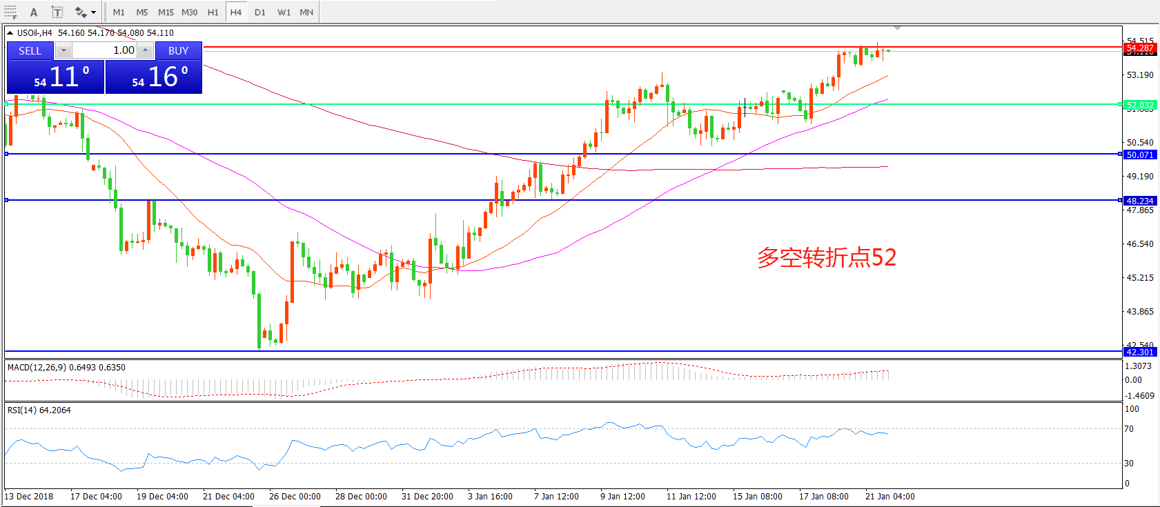 4小时图看,油价经过连续整理站稳52美元,短期整理后受制于54美元关口, 均线系统呈多头排列, MACD红柱增加,重点关注上方阻力。