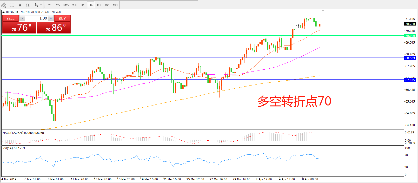 4小时图看,油价突破70美金后阳线连续拉升,虽触碰上方阻力后有所回落,但短期走势依然偏强,均线系统呈多头排列,MACD红柱增加,RSI指标走平,日内延续上行概率较大。