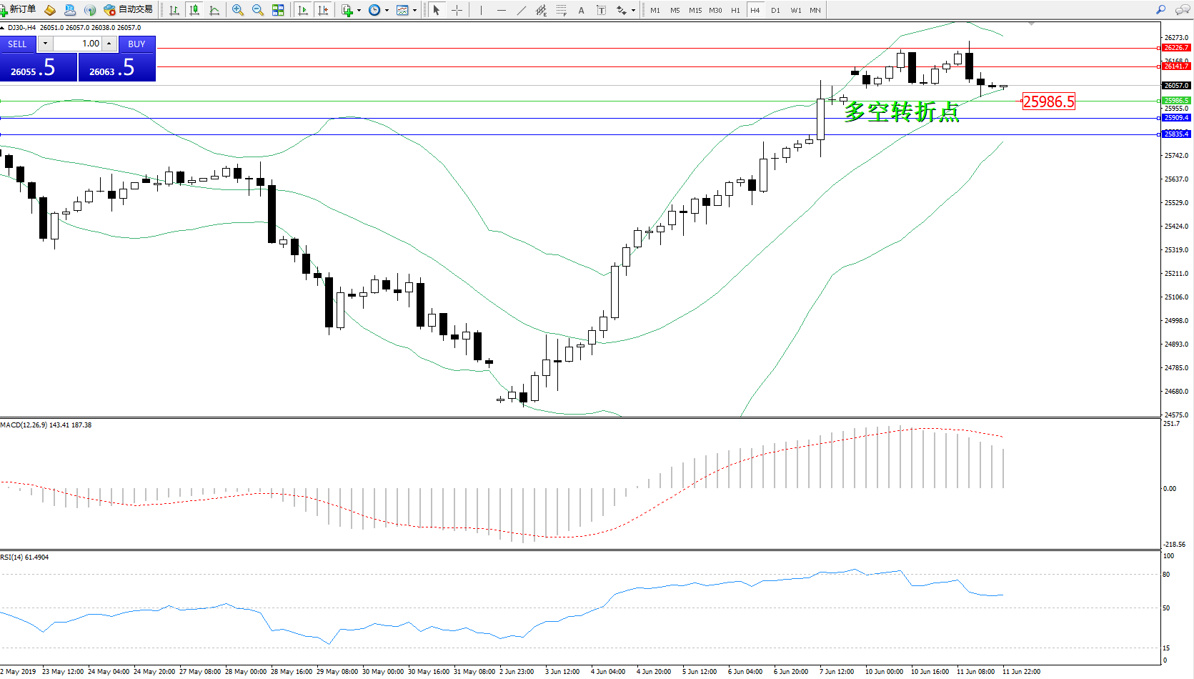 道琼斯指数DJ30—— 4小时线图显示: