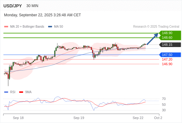 在 147.50 之上,看涨,目标价位为 148.60 ,然后为 148.90 。