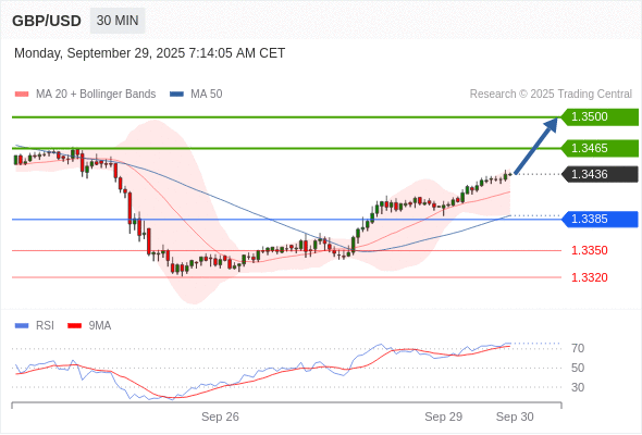 在 1.3385 之上,看涨,目标价位为 1.3465 ,然后为 1.3500 。