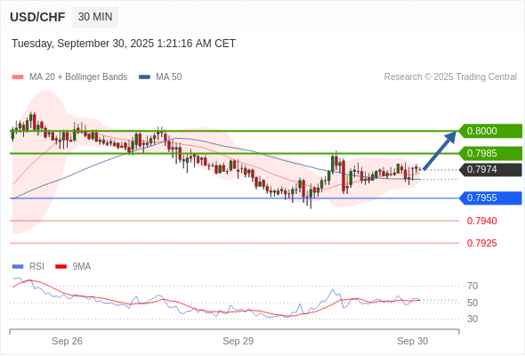 在 0.7955 之上,看涨,目标价位为 0.7985 ,然后为 0.8000 。