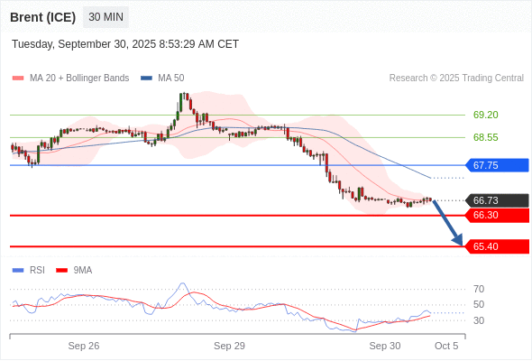 在 67.75 之下,看跌,目标价位为 66.30 ,然后为 65.40 。