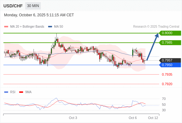 在 0.7950 之上,看涨,目标价位为 0.7985 ,然后为 0.8000 。