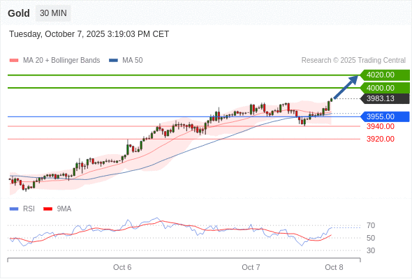 在 3955.00 之上,看涨,目标价位为 4000.00 ,然后为 4020.00 。