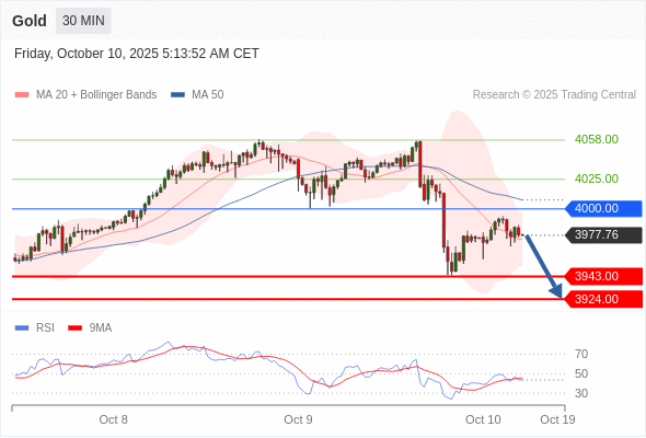 黄金现货 当日内: 短期关键阻力位在4000.00。